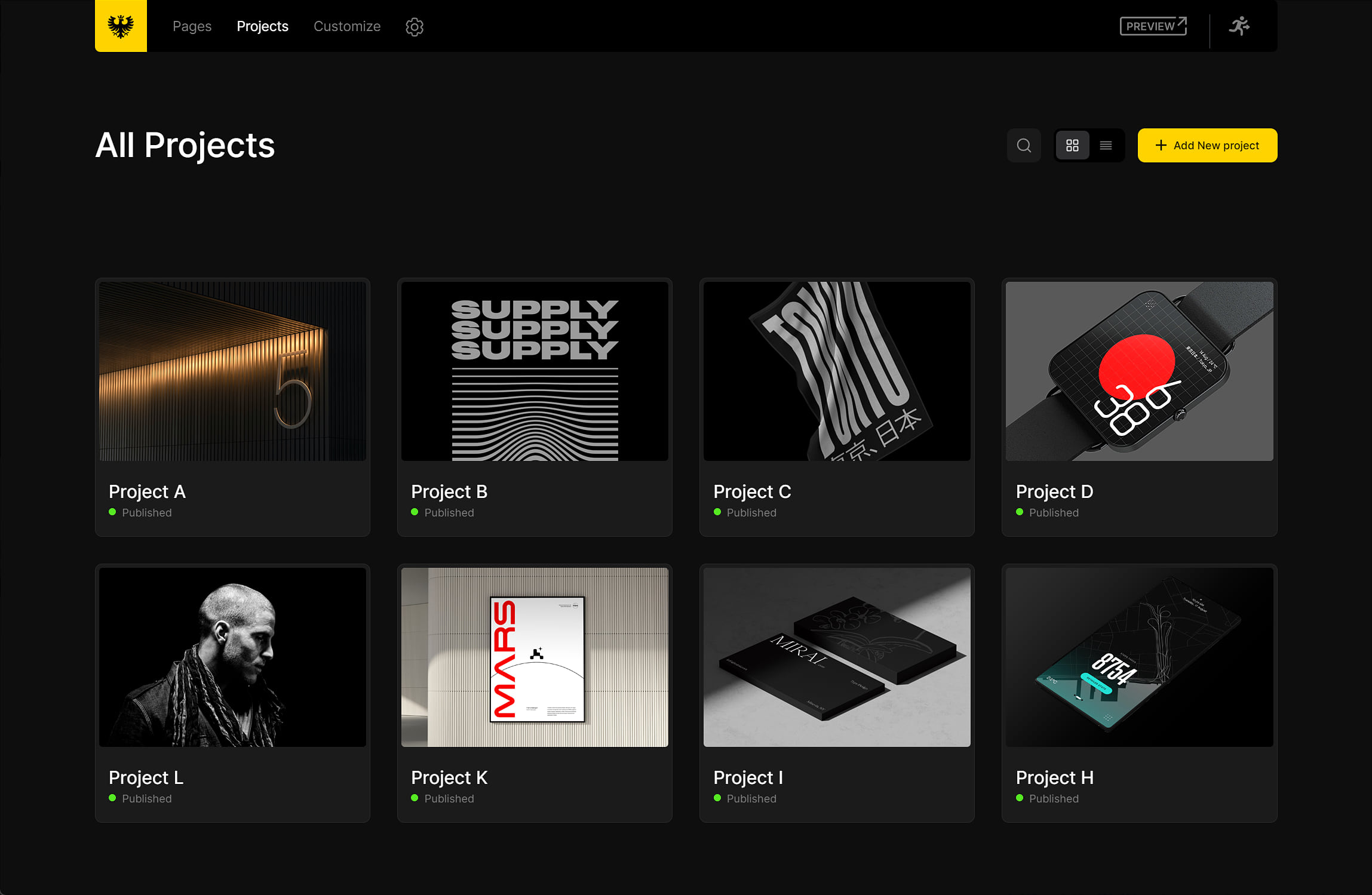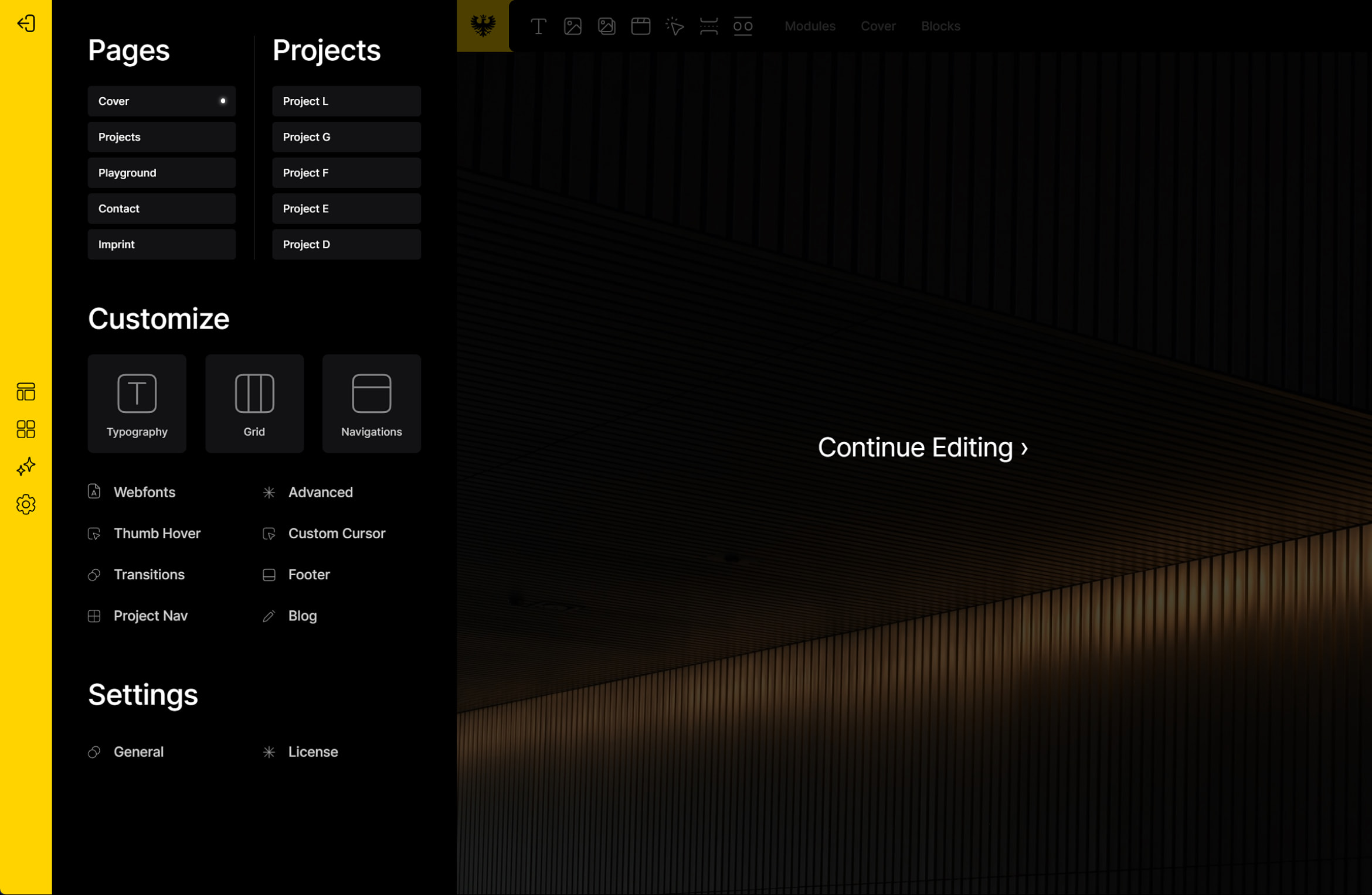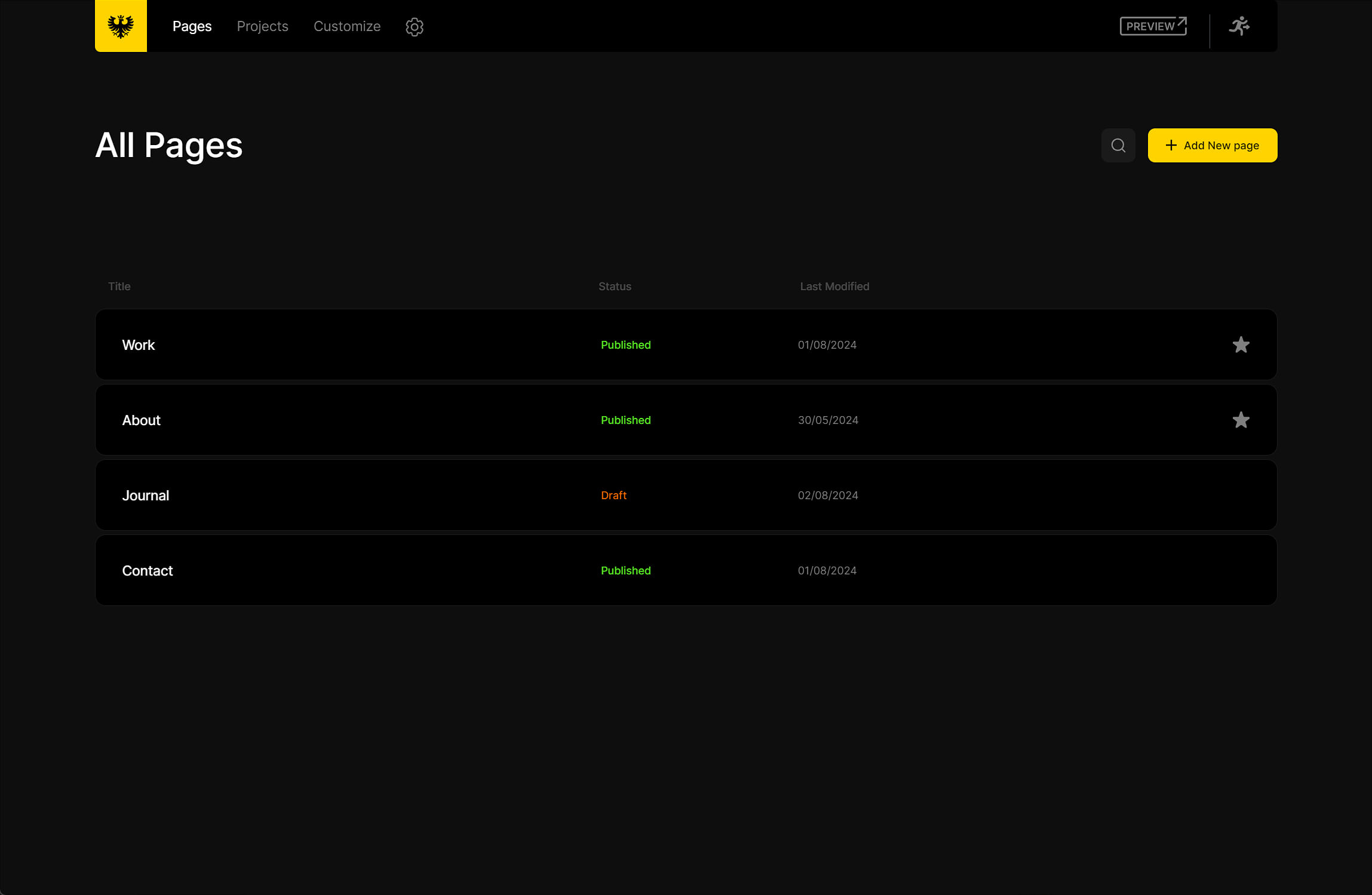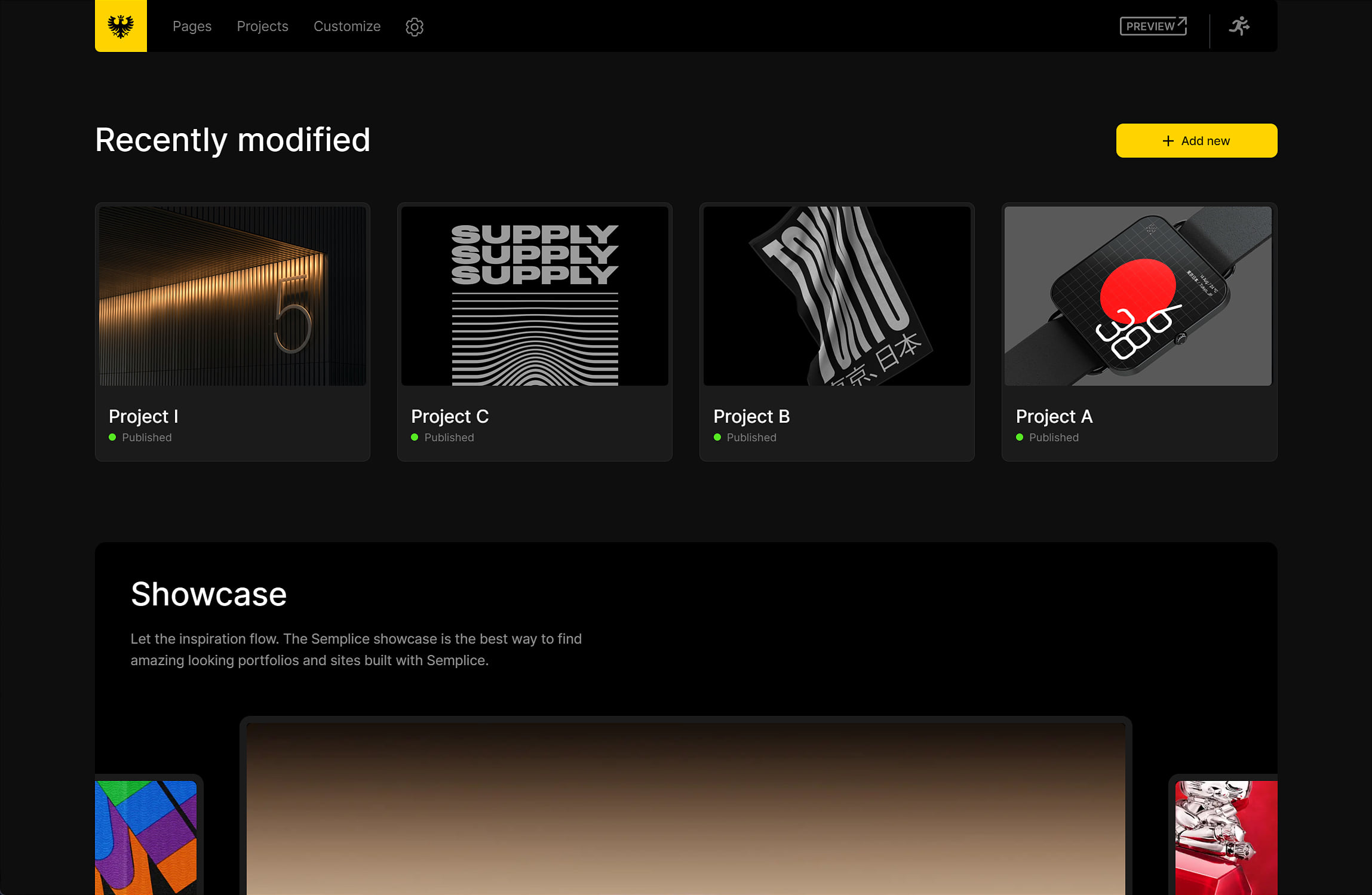 Your Semplice command center. The building experience begins here with Pages, Projects and other options that create the foundation of your portfolio.