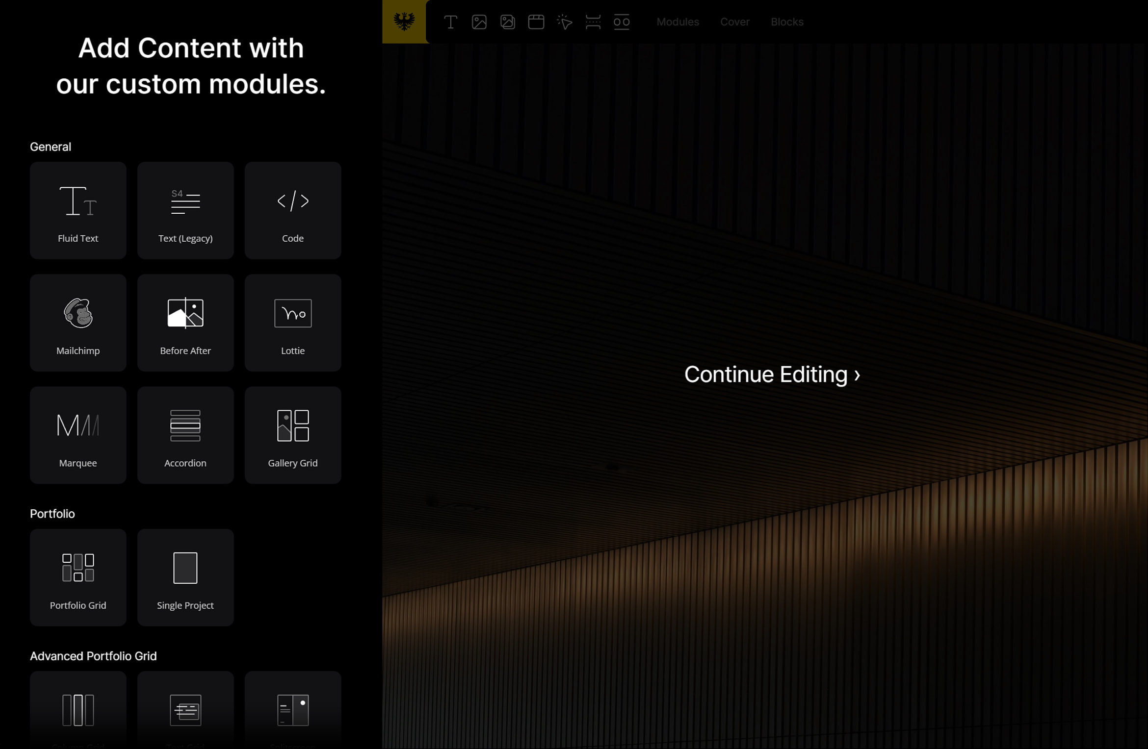 The only building experience made for a designer’s mind. Build on a grid with visual drag & drop. Clean and intuitive with dead-simple features, it enables evolution. Take your site live one day, change it up the next.